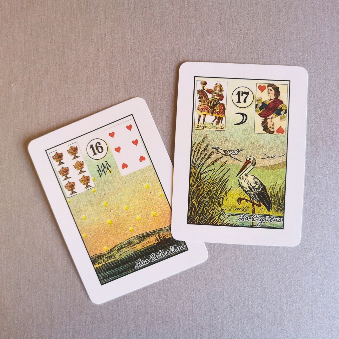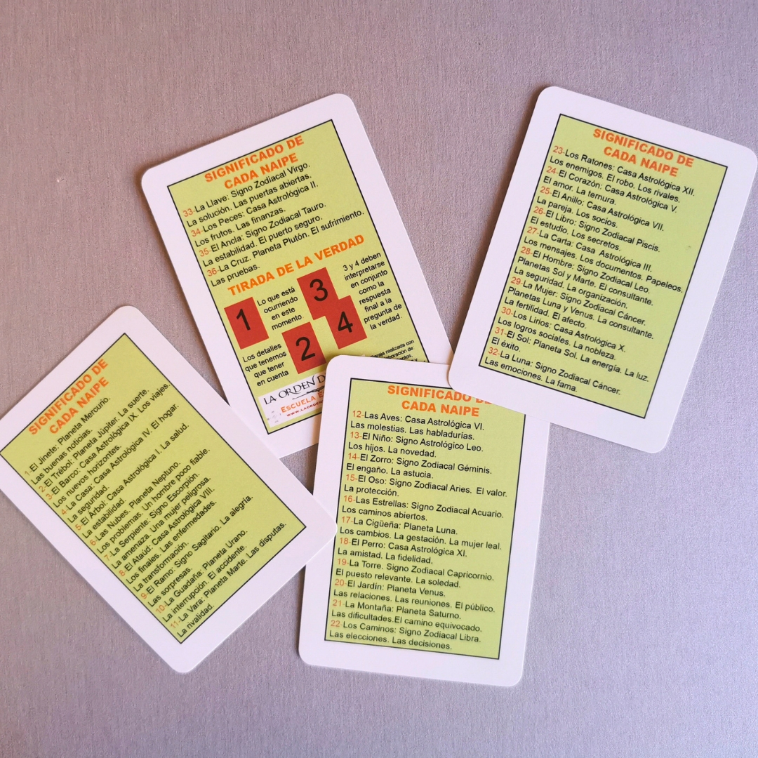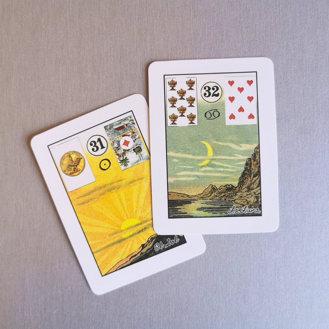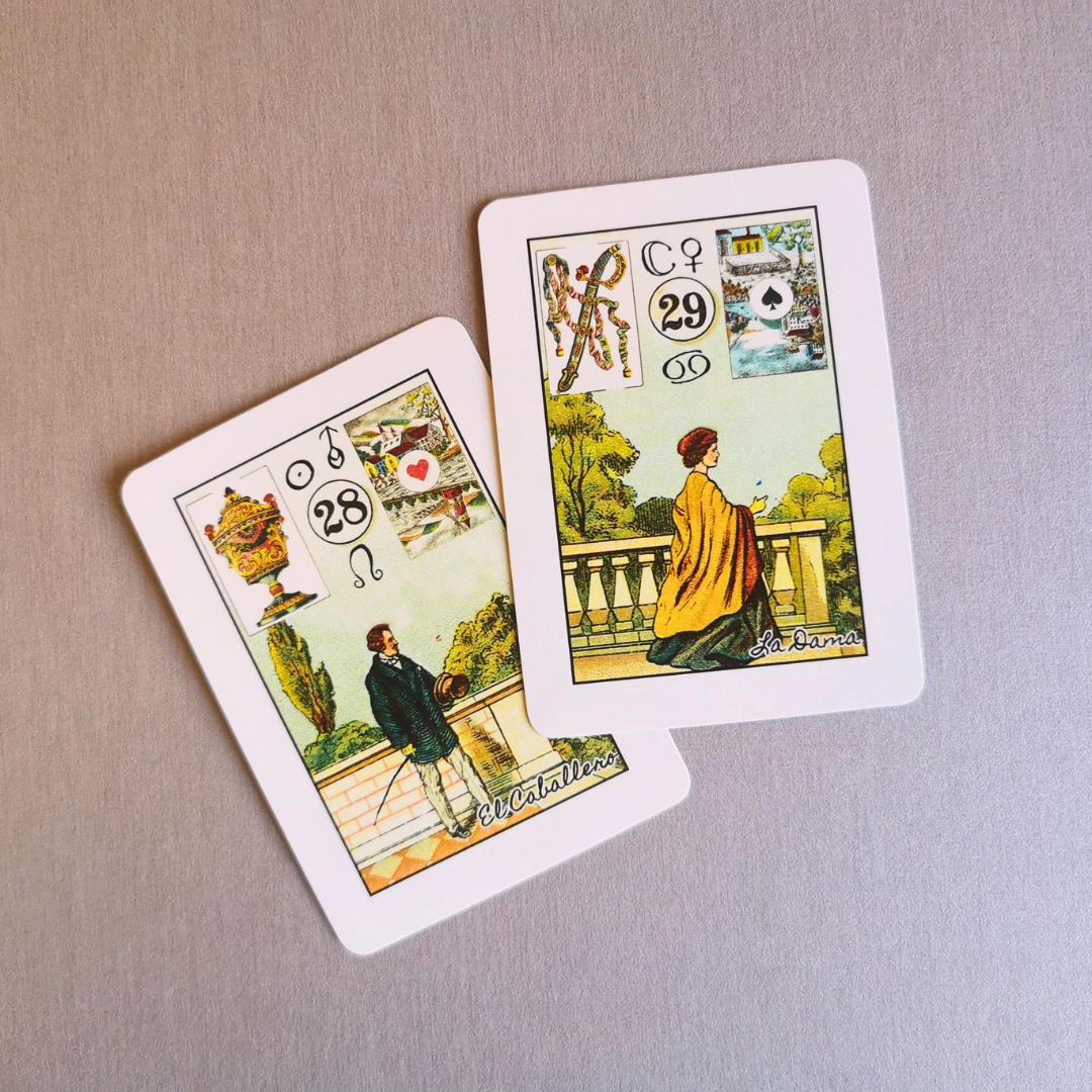 Baralho Cigano com símbolos astrológicos O Baralho Petit Lenormand com cartas explicativas em espanhol.