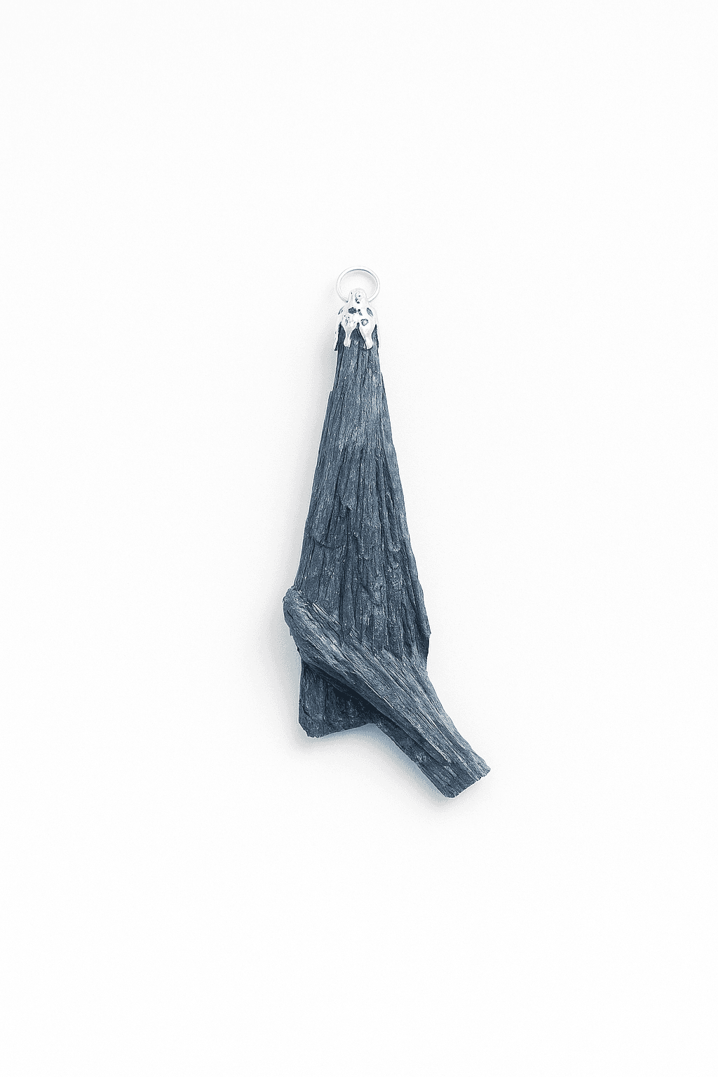 Este elegante pendente de Cianita Negra, conhecido também como “Escova de Bruxa” devido ao seu formato natural que lembra uma pequena vassoura mágica, é uma peça única e poderosa para quem procura proteção energética, equilíbrio e ligação espiritual.