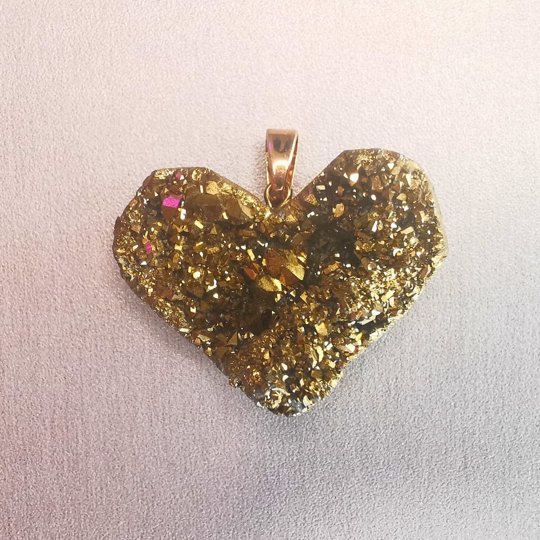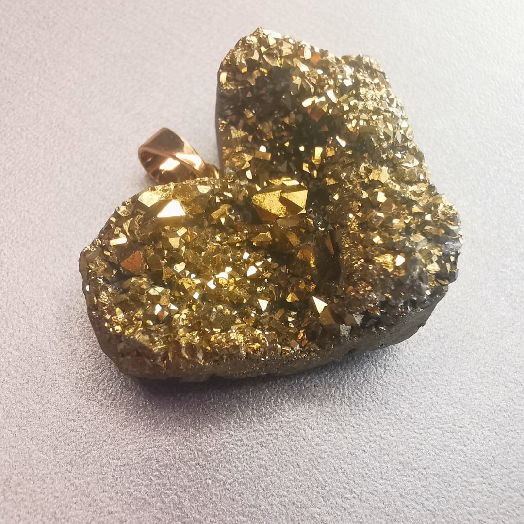 A pirite simboliza abundância. Muitas pessoas acreditam que esta pedra atrai oportunidades, clareza e prosperidade. Quando a levas junto ao peito, manténs a energia focada no crescimento e no sucesso. A pirite também é associada à proteção espiritual. Diz-se que ela cria uma barreira energética firme, capaz de bloquear negatividade e influências externas. Essa vibração confere segurança, firmeza e clareza emocional.