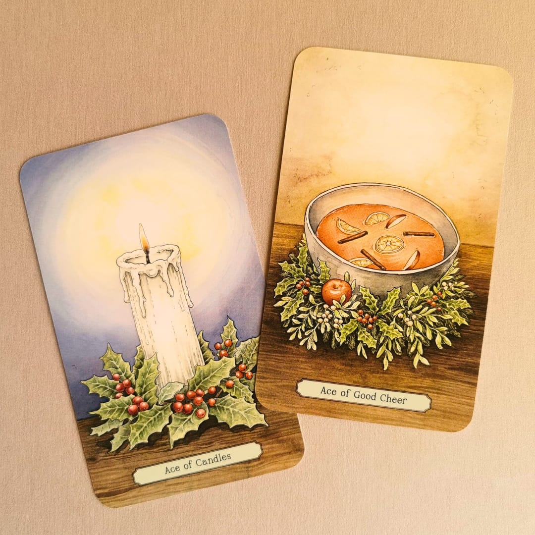 Neste baralho festivo, os naipes foram reimaginados com um toque temático e acolhedor: velas representam o fogo do naipe de Paus, simbolizando inspiração, vitalidade e a chama interior. Boa-venturança e alegria aparecem como o naipe de Copas, traduzindo emoções, vínculos afetivos e calor humano. Bengalas doces tomam o lugar do naipe de Espadas, trazendo uma abordagem leve e simultaneamente afiada aos desafios e decisões. Presentes substituem os Pentáculos, refletindo generosidade, prosperidade e a materialização de bênçãos. Estas escolhas conferem ao baralho uma atmosfera única que aproxima a leitura de tarot ao imaginário natalício que tantos apreciam.